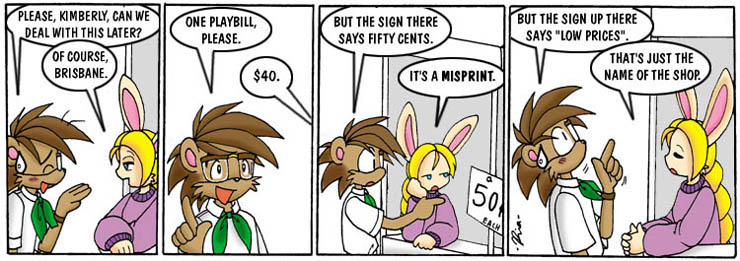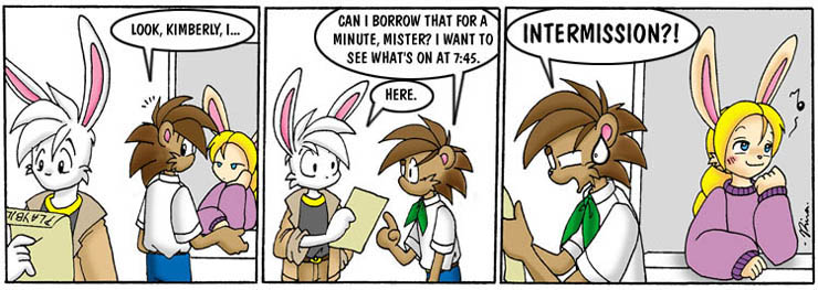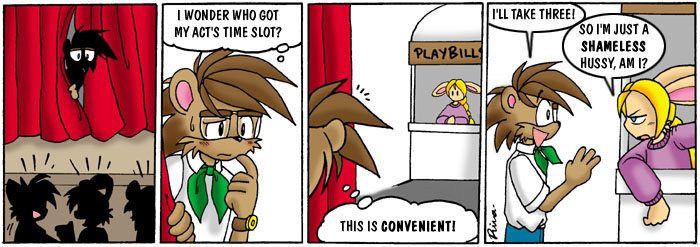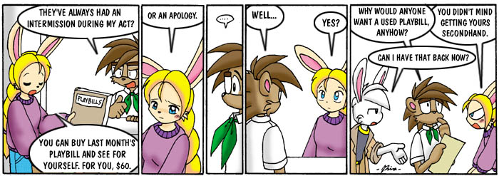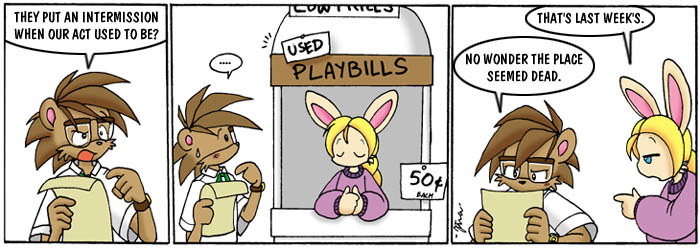 This arc is called One Page. It wasn't just a reference to the playbill. Each day a new comic was added to the front page, so on Friday you saw all five. There was less recapping and less time passing between each comic, I suppose. It was meant to be seen as one coherent unit. Most comics happen one right after the other, though, regardless. I think I had just read one of Scott McCloud's books and wanted to do something artistic with the comic.