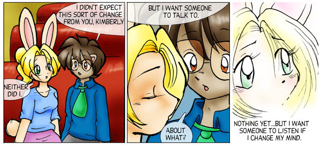 Now, if the last panel of the previous comic had been wordless, and Kimberly started out this one with "It's hard being alone, you know", that would've been a perfect moment. It's not supposed to be a continuation of the conversation. It's Kimberly saying something that desparately needed to be said, out of nowhere, after a reflective silence. I may not have intended it that way when I wrote it, but I intend it that way now; I like to think that I understand the scene better now.