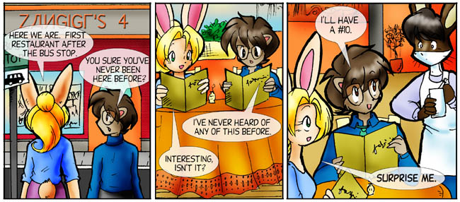 The restaurant name doesn't translate to anything. G isn't a Cyrillic character. And, as I usually do, they order by number so that I don't need to figure out what they're really eating. The script just specified foreign. The waiter is based on Ridge, one of Isabel's older characters, who would later show up in the Grover Hills series. Something Else pt 3