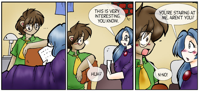 The script originally included "(Nina covers her exposed ankle, blushingly)" in the stage directions fort he last panel. I'm glad that wasn't how it turned out. It works better if Nina is embarassed at being seen than overly modest.I had remembered this arc as being "Brisbane chooses between Kimberly and Nina". Upon reflection, I don't think it turns out that way exactly. Nina is a very popular character, and I wanted to do more with her. On the other hand, I didn't want to use the common manga trope of "One girl shows interest in moderately unpopular male lead. Within a week, he's got a multitide of women pursuing him".