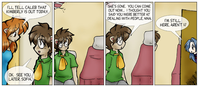 I have nothing to say about these comics, so let me post my original notes for this arc: Brisbane thinks Kimberly is mad at him. Really mad. He doesn't know what to do. He gets some flowers. Sofia asks him about them and he gives an evasive answer. Nina shows up again. She left a note for him but he never got it because she left it in a very obscure place. She smiles at him, takes the flowers, and leaves for the moment. Later, Kimberly shows up and things seem to be allright between them. He wasn't wearing his glasses when he saw her in the shower, so she thinks that he couldn't really see her because of that. It turns out that his glasses are just for reading. He has a chance to tell her about Nina, but doesn't. He's not sure where he stands with Kimberly, though. They may be friends, or there may be something more. She sees him reading without his glasses and gets very mad. She leaves.