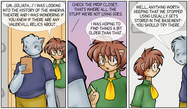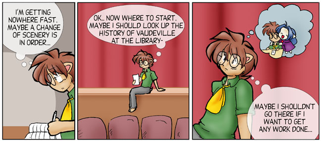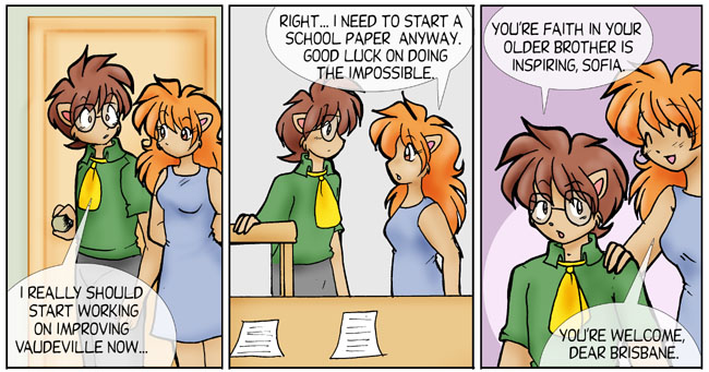 So, what does Brisbane want? Again, he's not competing with Kimberly or with Peter & Friends any more. If he wanted to impress Nina, he could just go to the library and talk to her. The previous week seems to shift the perspective of the comic; the viewpoint character is Kimberly instead of Brisbane, so his motivations are slightly hidden, the same way Kimberly's were at the beginning of this.