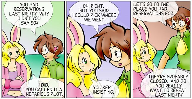 So, yes. The conflict that Brisbane saw as "We stayed out too late and I ended up sleeping in her bathtub and seeing her naked" is restated as "Your reasonable paranoia has ruined the romantic evening I planned, and circumstances wouldn't even let me salvage it as a pleasant breakfast". As you've seen from my notes, I had originally planned on emphasizing the first one and adding wacky hijinks to it. That's what would've happened if the giant machine went down the wrong path, and it took a while for me to adjust the direction it was headed in.