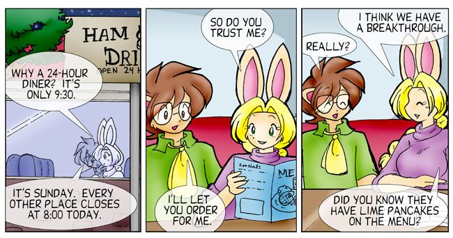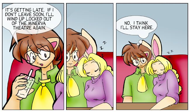 This is how it had to end. Not with a great explosive romance, but with two people being comfortable with each other. Not marriage. Not sex. Just comfort. But being comfortable with someone is rare and special, especially for Brisbane and Kimberly.After Unlike Minerva ended, I didn't think I'd ever do webcomics again. I figured I'd served my time and was a free man. Or at least that's how I remembered it. Then I checked the dates (and saw the crossover a few weeks ago) and noticed that Spare Parts began a few months before Unlike Minerva ended. It surprises me that I started one series while trying to finish this one, and I'm glad I didn't take the easy way out and abandon Unlike Minerva to work on Spare Parts. I still distinctly remember the feeling of not having a webcomic to work on, even though that hasn't happened at any point in the last ten years. About a year after Unlike Minerva ended, right before we were going to move to California, Isabel shows me the first arc of You Say it First that she just wrote. It was amazing. It transformed the comic but left the characters intact. I wrote the second story, and we've been working on it together ever since. So long, it's been good to know you pt 2