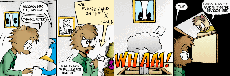 You'd think that by now Brisbane would learn to stand on the X when Caleb tells him to - it's usually safer that way. In the second panel's painting is Ignatz, from Krazy Kat.