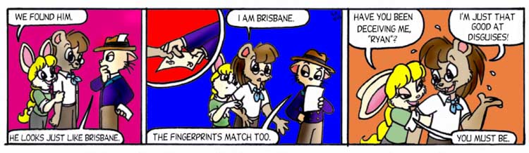 Because Brisbane-as-Ryan-as-Brisbane had to happen at some point. If it was a better disguise with different mannerisms, Brisbane would've slipped up from time to time and been himself. And to make it seem like he was Ryan-as-Brisbane, he'd have to slip up and occasionally act like Ryan, to make it "believable". Except, well, the disguise is just no glasses and no ascot.