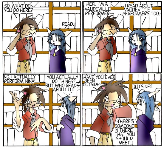 This is kind of what I was going for two weeks ago, with the clever inversion of subjects. Kind of. "I'm not a ghost!" would've been Nina's catchphrase if she had one.