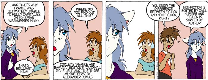 Yes, it's a reference to the Thirty Years War. The original plan for Nina was that she read and believed everything. This got very complex very quickly, and wound up getting dropped because it was more trouble than it was worth. I probably could've done a lot with it if I were astoundingly well-read. At the time, I enjoyed odd, old books that nobody else bothered with. If I kept it up, it would've been a lot of work for something that nobody else would really get. It's kind of a shame, because I want to be hip but my tastes run towards the very obscure.