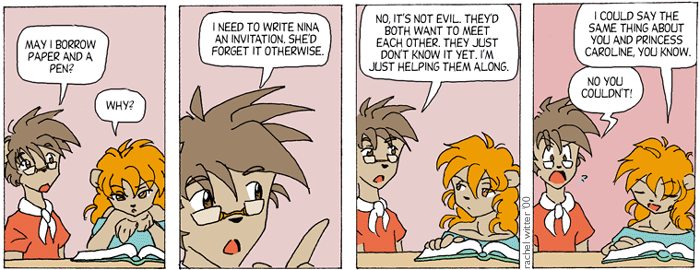 It was never mentioned, but Sofia's backstory involved her being a legitimist - supporting the restoration of monarchy throughout Europe and Hippedown. She's very politically conservative in a context that no longer exists. It didn't ever come up because it didn't have anything to do with the rest of the comic. I had intended to do something satirical with it, but never did.