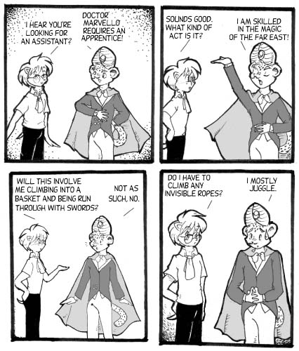 Dr. Marvello is named after a Klaatu song. The one in the song has a love machine that turns can't to can. This one just juggles. He spends a lot of time denying that he's just a juggler. He has to admit it at least once, though, because otherwise he's just someone who says he doesn't juggle (as opposed to a juggler with delusions of oriental magic).