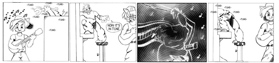 There are many weeks I look back upon fondly. This is not one of them. The title is a play off of "Boom Tune", the working title for Syd Barrett's "Here I Go". I don't especially like the song either. In retrospect, "Peter hits the keys and things look really out of tune" was probably the worst single line of instruction I gave an artist. I'm not sure what I was expecting. Since I sent out all five scripts, and got the comics all back at once, I couldn't make adjustments as I went along.