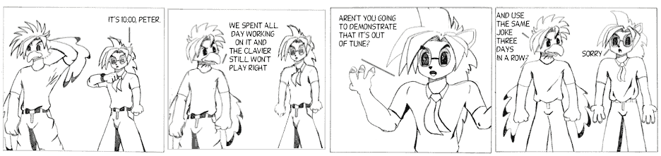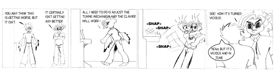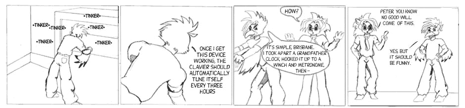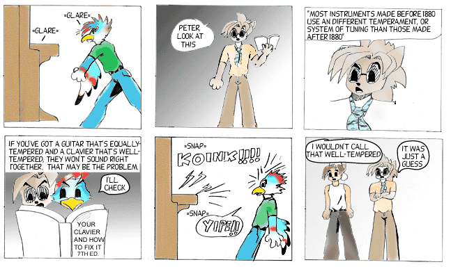 The alternate title for this arc was "The Ill-Tempered Clavier", a play on "The Well-Tempered Clavier", by Bach. Temperament has to do with the amount of "space" there is between notes. A well-tempered instrument sounds better when playing one in specific key but worse in others. An equally-tempered instrument rounds things so that it sounds pretty good in any key. Just about every instrument is equally-tempered these days. I can't hear the difference but I'm assured that carefully trained musicians can.