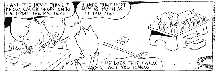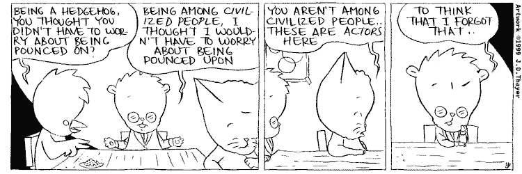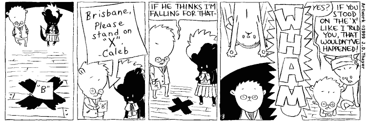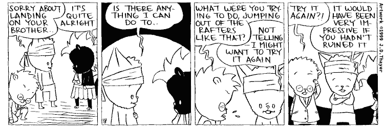 I like to do strips like this to build anticipation of what will happen next. This is by Joda Thayer, who did Few and Far Between (and currently does a Chipmunk and a Lizard).