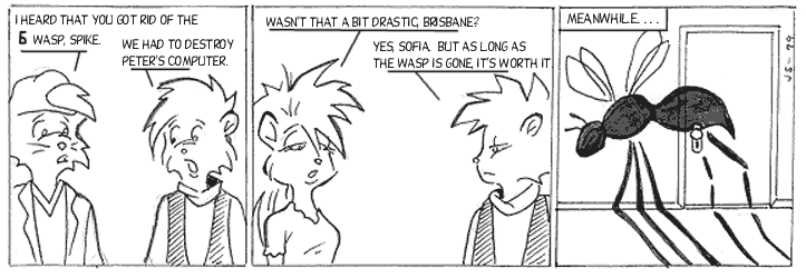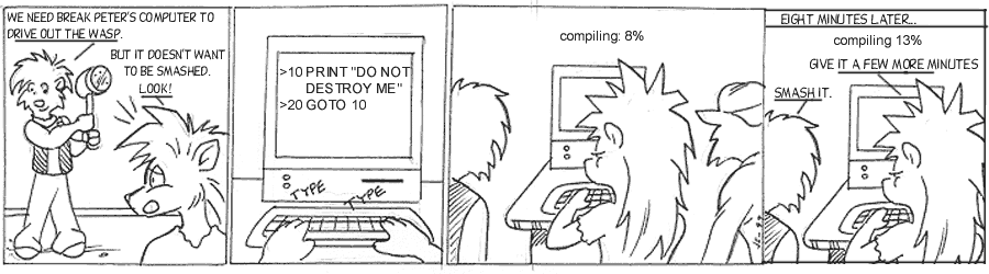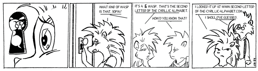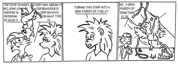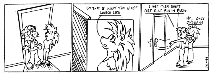 Ok, so the word placement in the first panel could've used some work. This was based on Ralph leaping out at Kevin and crashing into things, which was one of Kevin & Kell's running gags. Then Ralph gained weight and stopped attacking Kevin.