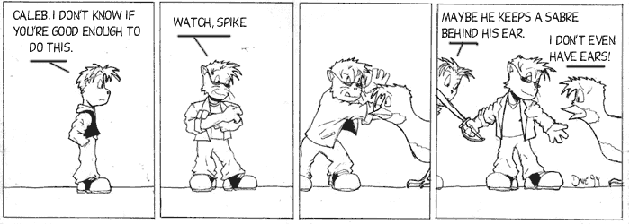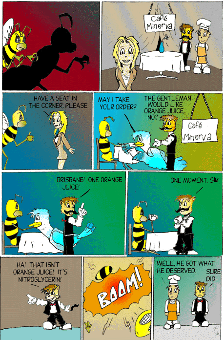 I had decided that "That isn't orange juice! It's nitroglycerin!" was the funniest line ever, which is why it ends this way. With bad costumes, a hastily built 'restaurant' set, a fake moustache, and explosives. Anyhow, I offer this as a lesson to everyone else who wants to do comics: You can end all of your stories with things like this, or you can end none of your stories with things like this, but if you only end few of them like this it seems weird.