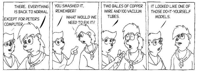 Matthew Gardner used to do this comic called It's Gravy. He's currently doing some things with Floating Hands Studios. But yeah, I think it's a bit unfair to call a computer a Do It Yourself model if all you do is plug three things in. If you don't wrap the copper around the magnets yourself, it's not a proper kit. And the copper is cheaper, causing the downturns in the Argentinian market mentioned at the very beginning of all this.