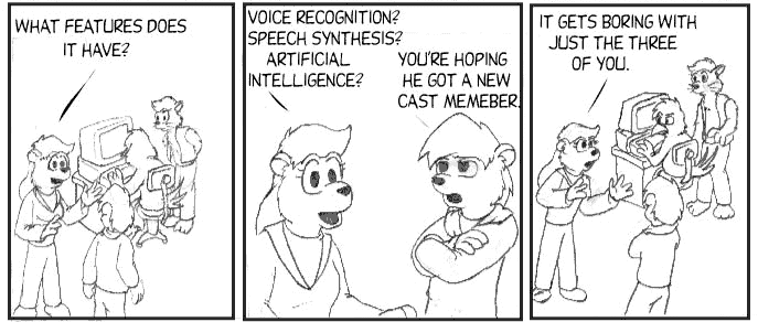 Yeah, the sentient computer sidekick thing seemed kinda overdone back in 1999. I think Bloom County's Banana Jr. inspired a lot of similar work. Take that, other comics. Also, take that, fourth wall.
