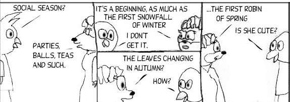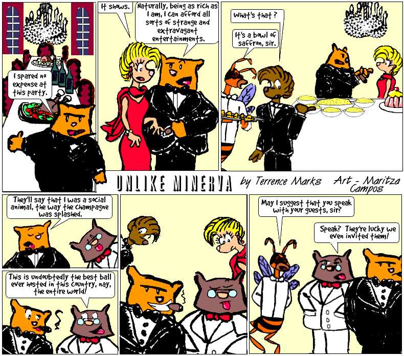 And we have one comic drawn by Maritza Campos, whose College Roomies from Hell started a few months before Unlike Minerva did - yet another member of the Class of 1999. The line, "They'll say I was a social animal, the way the champagne was splashed" is from Martin Newell's "The Greatest Living Englishman". Saffron is the most expensive spice in the world. I'm not really sure what it tastes like, but nobody with any sort of class would just serve it in finger bowls. Therefore, it's being served in finger bowls