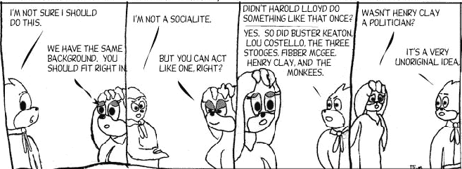 Breaking into high society was a popular topic among early comic strips (like Bringing Up Father, for instance). So was horse racing, and between those two things you've got most Marx Brothers movies.