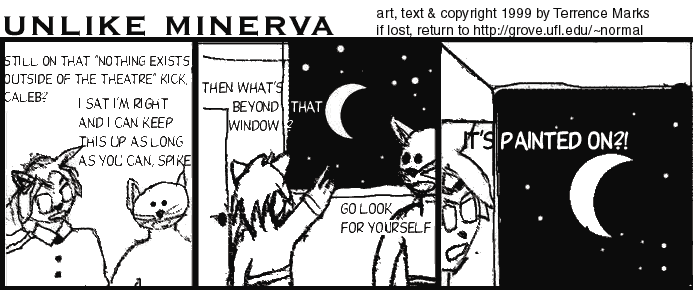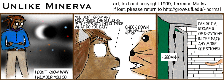 This comic was undrawn for a few weeks, and was posted in script format. Kevin Pease, who had recently moved Absurd Notions onto the Internet, was kind enough to draw this for me. I'm very glad he did. I like the writing on this, but don't think I could've sold the punchline nearly as well as he did.