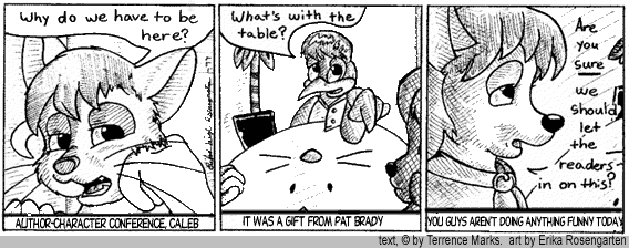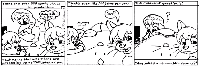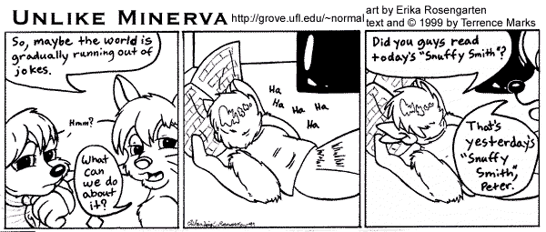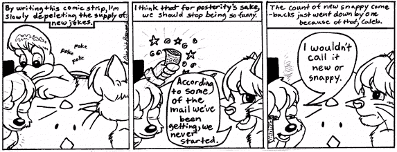 I believe that Peter's actions were the artist's idea. It took me a while to figure out how to give proper direction for action. I'm glad Erika added that because otherwise it's a talking heads comic, all week long. There are at least ten times as many webcomics now as there were back when this strip aired in 1999. Probably fifty times as many. And just as many comic strips, because comic strips never die. It's a ridiculous concept, but I have to wonder how many jokes there are and if we ever will run out of new ones.