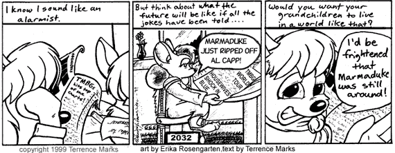 "2032 - Housewives shock in blue" is from "What in the World", by the Dukes of Stratosphear. I'm not sure anyone got the reference. I probably gave instructions about who that was in the future. I don't remember them, though. I had a few other comics written that flashed forward for a panel or two, but that concept got too complicated to justify itself. Anyhow, yes. Marmaduke will go on forever due to sheer inertia, as will Al Capp. As of the time of this writing, they've just surpassed 20,000 comics about how damn big that dog is; I mean, there has to be a limit to how many jokes can be made from that concept, and there has to be a limit to how many concepts there are.