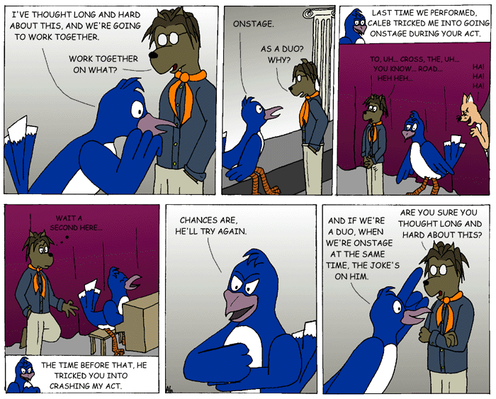 The Sunday comic was drawn by Adam Greengard. At the time, he was doing a comic called No Outlet, which has, unfortunately, disappeared from the Internet entirely. I believe he added Brisbane's joke in the third panel; that's not like the bad jokes I gave Brisbane in the past, at least. This comic got put into the revised, post-reboot archive because I liked it and, unlike the rest of the week, it fit the context